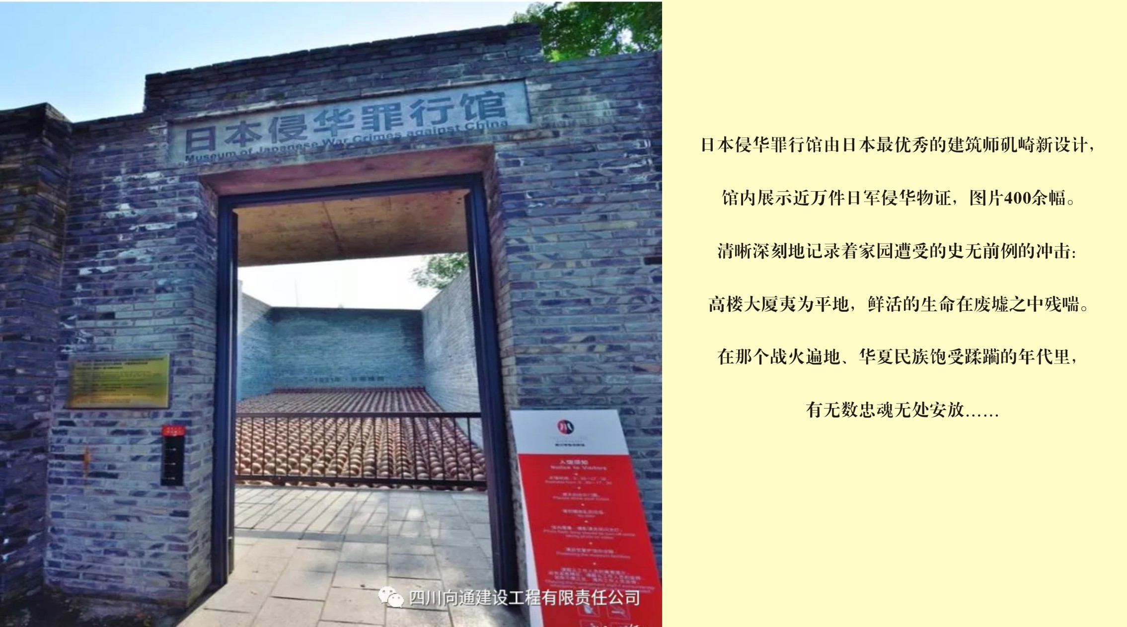 磯崎新設(shè)計(jì)的日本侵華罪行館,建筑面積2500平方米。建筑物采用弧線為主的結(jié)構(gòu)凸顯時(shí)代感。而所使用的又都是中國西南一些比較原始、能凸顯古韻味的建筑材料,“既結(jié)合了當(dāng)代建筑的精神,又兼顧了其歷史展示的作用”;氣勢(shì)恢宏,莊嚴(yán)肅穆,是一處以史料、文物、建筑、雕塑、影視等綜合手法,全面展示日本侵華罪行的專史陳列館。